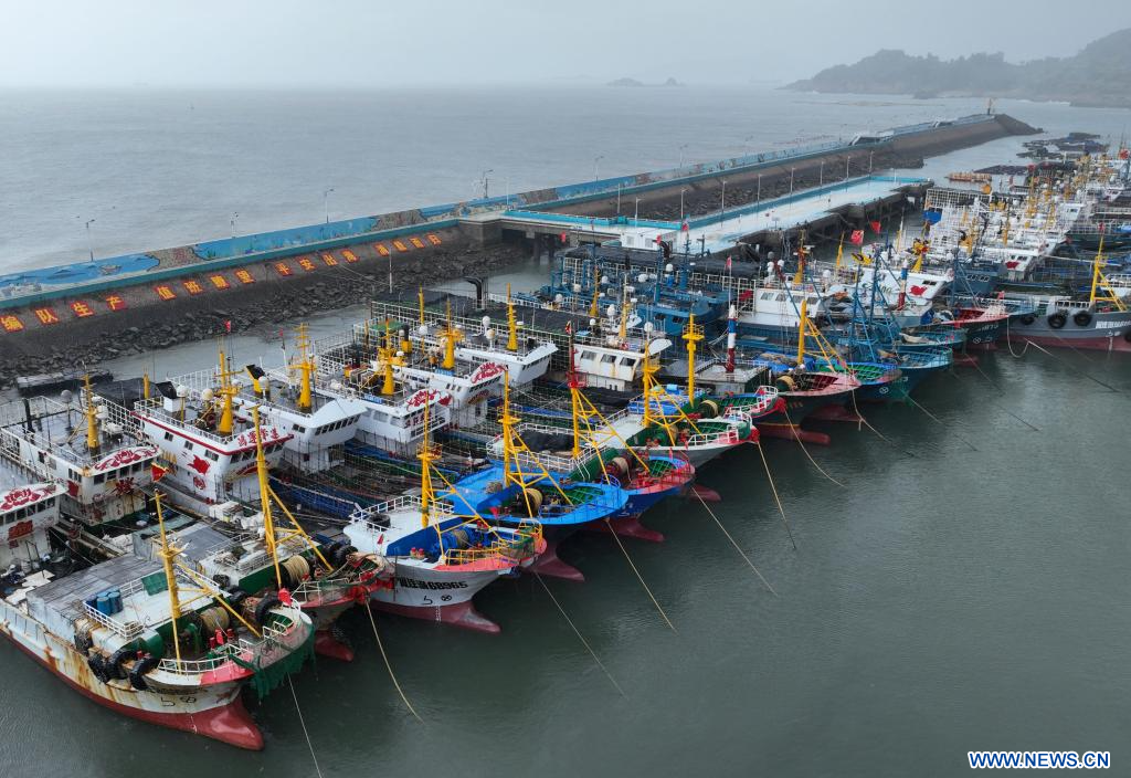 FUZHOU, 25 juillet (Xinhua) -- Photo de bateaux de pêche s'abritant à l'approche du typhon Gaemi dans un port du district de Lianjiang à Fuzhou, dans la province du Fujian (est), le 24 juillet 2024. Les provinces du Fujian et du Zhejiang dans l'est de la Chine ont mis à jour mercredi leurs alertes aux typhons, alors que le typhon Gaemi, le troisième de cette année, devrait frapper la côte du Fujian jeudi. (Photo : Wei Peiquan)