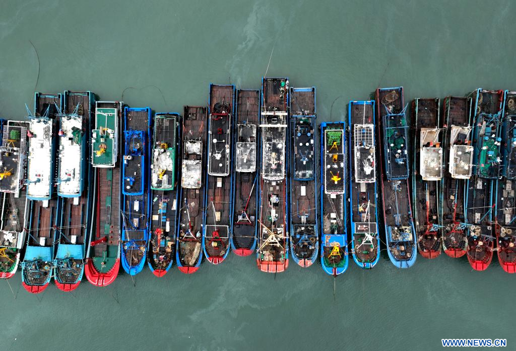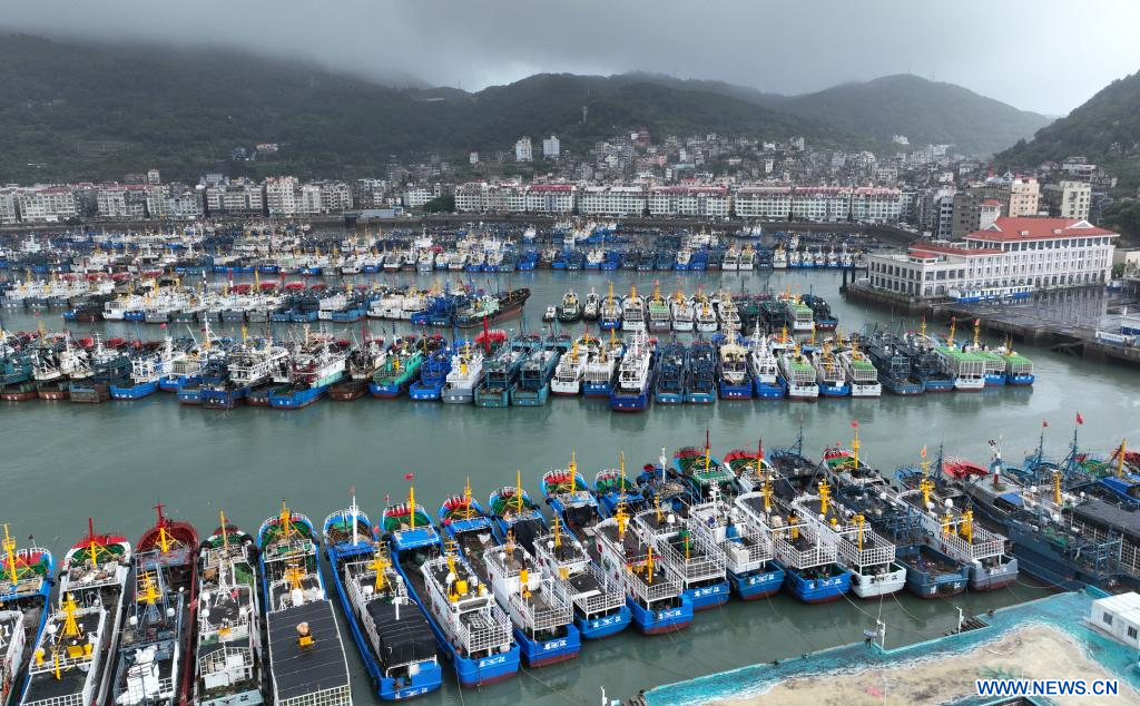 FUZHOU, 25 juillet (Xinhua) -- Photo aérienne de bateaux de pêche s'abritant à l'approche du typhon Gaemi dans un port du district de Lianjiang à Fuzhou, dans la province du Fujian (est), le 24 juillet 2024. Les provinces du Fujian et du Zhejiang dans l'est de la Chine ont mis à jour mercredi leurs alertes aux typhons, alors que le typhon Gaemi, le troisième de cette année, devrait frapper la côte du Fujian jeudi. (Photo : Wei Peiquan)