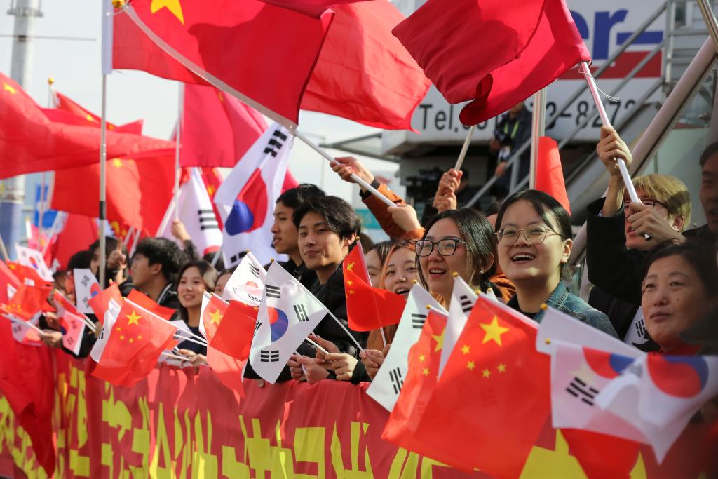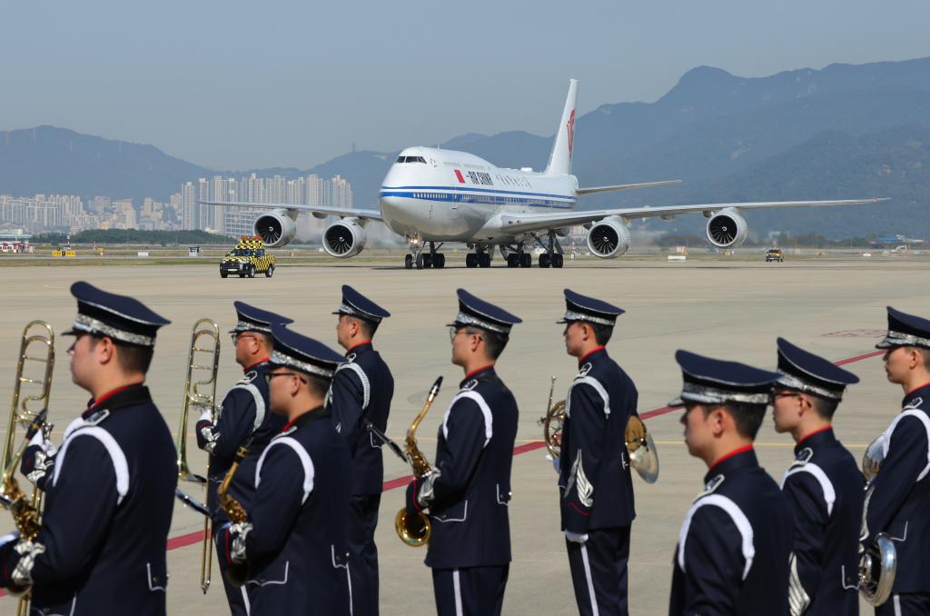 A son arrivée à l'aéroport international de Gimhae à Busan, M. Xi a été chaleureusement accueilli par de hauts responsables de la République de Corée, dont le ministre des Affaires étrangères Cho Hyun. Une salve de 21 coups de canon a été tirée à l'aéroport. Fin