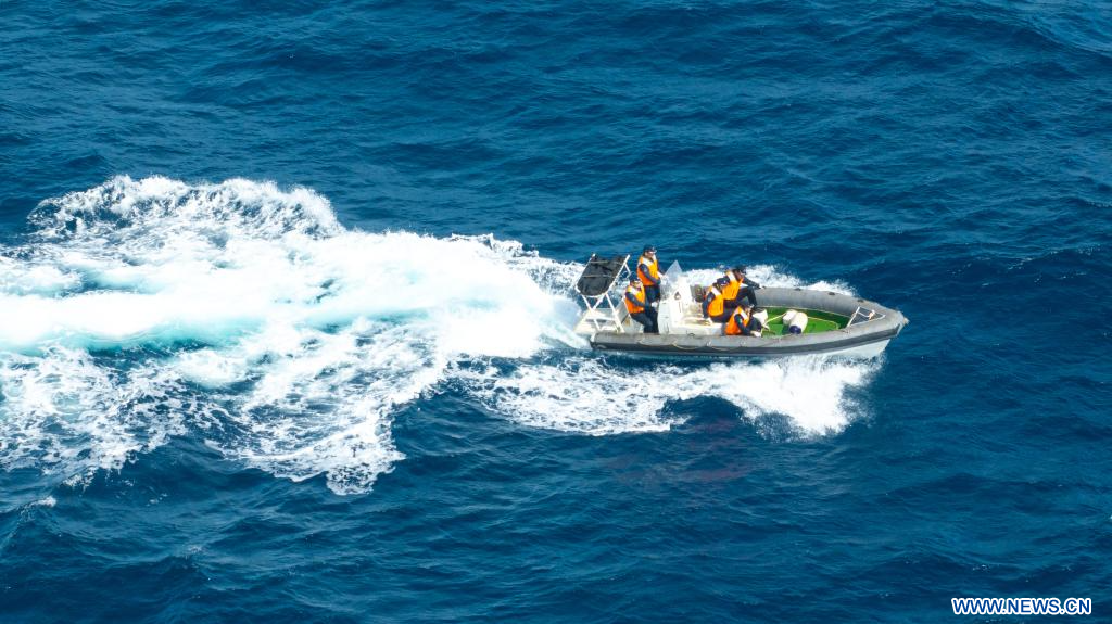 MER DE CHINE MERIDIONALE, 26 décembre (Xinhua) -- Photo aérienne du personnel chargé de l'application de la loi du navire Huangyan de la Garde côtière chinoise (GCC) patrouillant dans les eaux territoriales de Huangyan Dao de la Chine, le 14 novembre 2025.