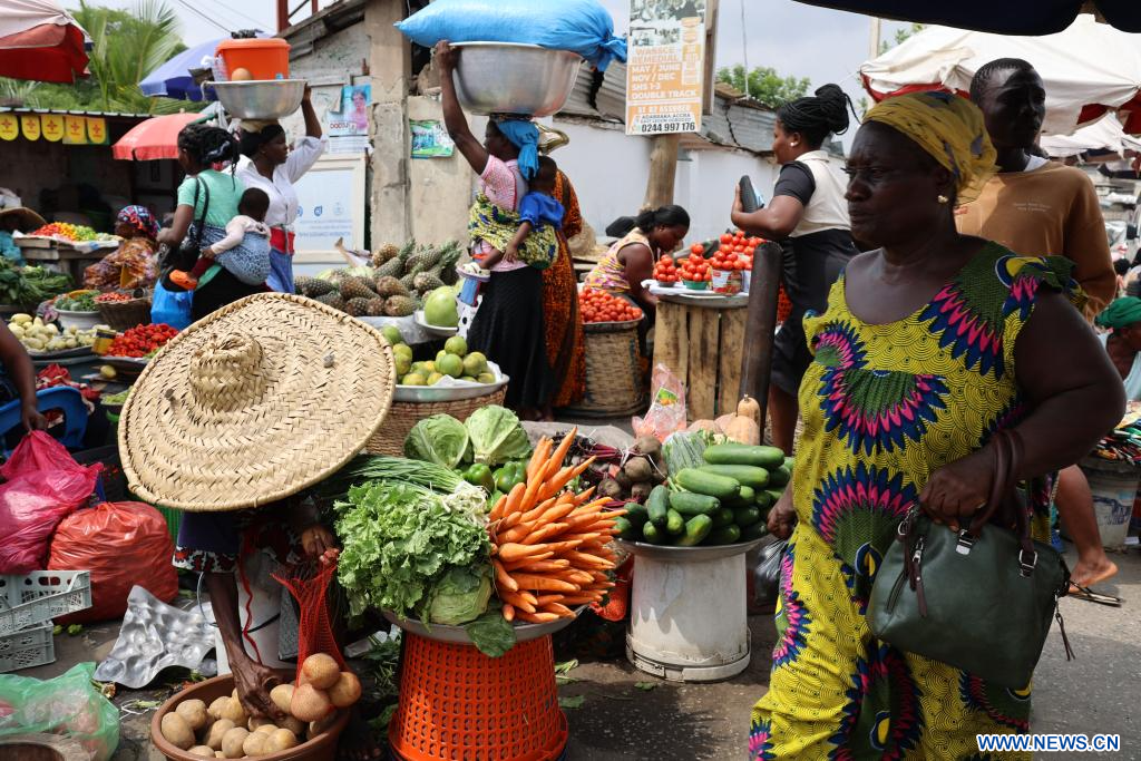 ACCRA, 15 janvier (Xinhua) -- Une femme passe devant un étal de légumes dans un marché de rue à Accra, au Ghana, le 14 janvier 2026. (Xinhua/Seth)