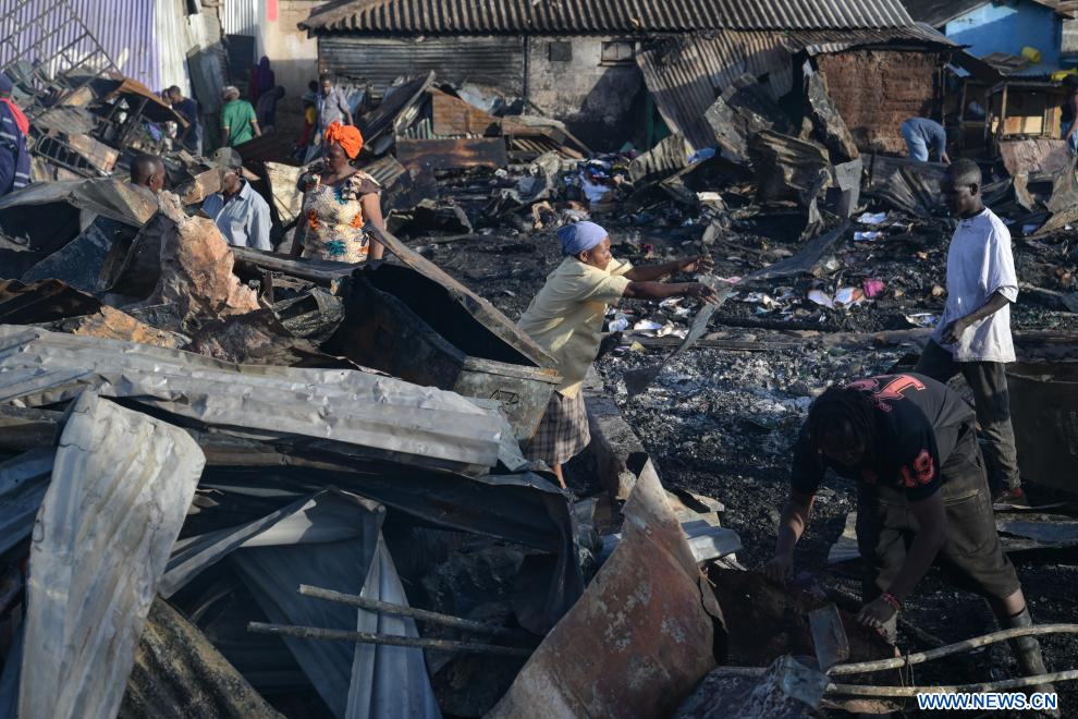 NAIROBI, 17 janvier (Xinhua) -- Des personnes nettoient des débris de maisons brûlées lors d'un incendie survenu dans le bidonville de Kibera à Nairobi, au Kenya, le 17 janvier 2026. Un incendie s'y est déclaré samedi, détruisant des dizaines de maisons. Aucun blessé n'a été signalé pour l'instant. (Xinhua/Yang Guang)