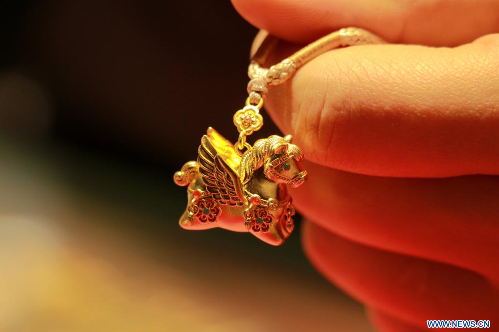 BEIJING, 21 janvier (Xinhua) -- Un produit en or sur le thème de l'année du cheval dans un magasin du district de Congjiang, dans la province chinoise du Guizhou (sud-ouest), le 16 janvier 2026. (Photo : Luo Jinglai)