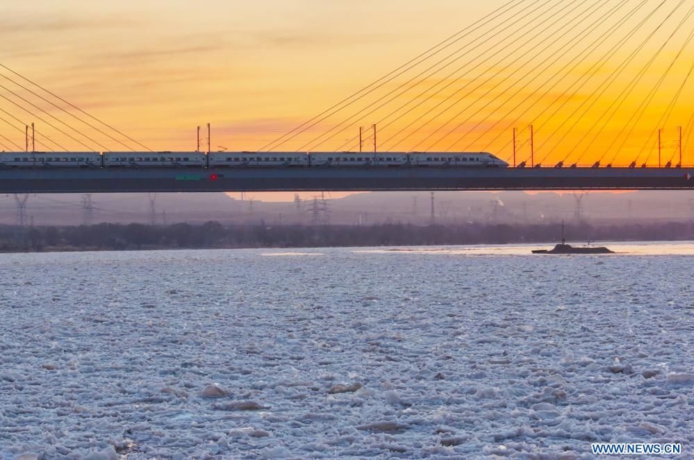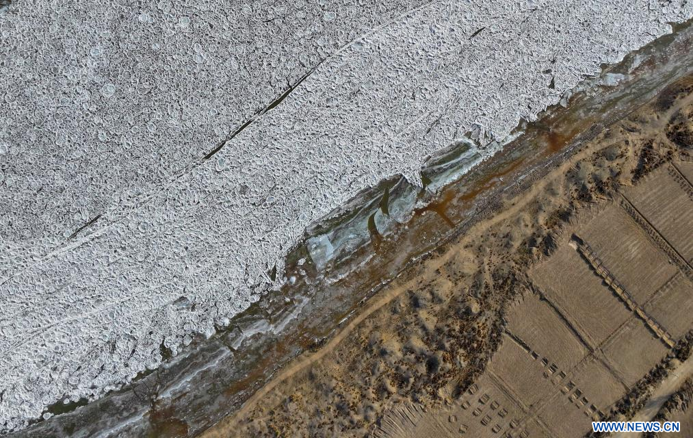 YINCHUAN, 22 janvier (Xinhua) -- Photo montrant le fleuve Jaune gelé le long de la frontière entre la ville de Shizuishan, dans la région autonome du Ningxia (nord-ouest de la Chine), et la ville de Wuhai, dans la région autonome de Mongolie intérieure (nord), le 21 janvier 2026. (Photo : Yuan Hongyan)