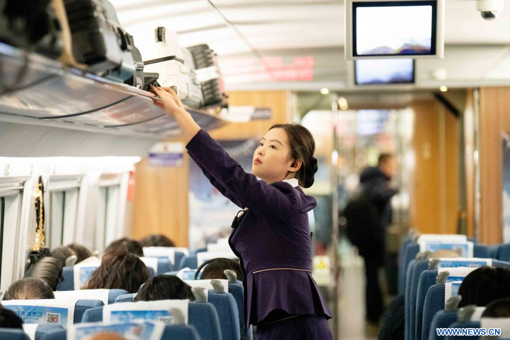 BEIJING, 26 janvier (Xinhua) -- Une hôtesse de train travaillant dans une voiture du train G2584 reliant Taizhou à Beijing, le 25 janvier 2026.