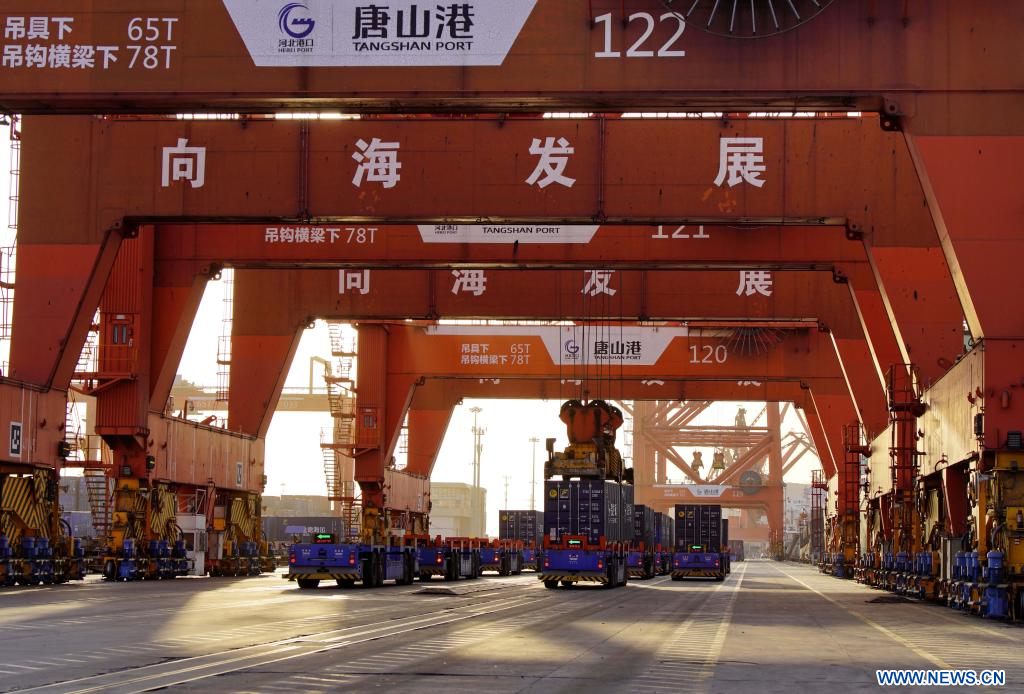 TANGSHAN, 6 février (Xinhua) -- Photo prise le 5 février 2026 montrant des véhicules sans conducteur travaillant sur un terminal à conteneurs du port de Tangshan, dans la province chinoise du Hebei (nord). Le volume de fret du commerce extérieur dans le port de Tangshan a atteint 381,56 millions de tonnes en 2025, soit une augmentation de 2,59% par rapport à l'année précédente. (Photo : Yang Shiyao)