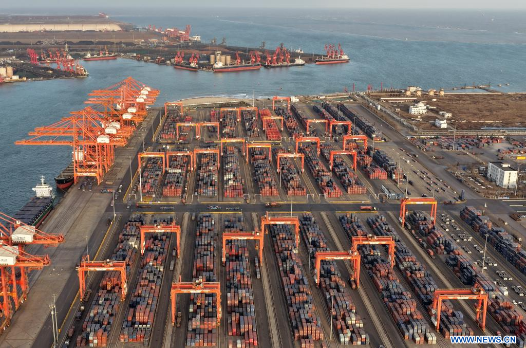 TANGSHAN, 6 février (Xinhua) -- Photo aérienne prise le 5 février 2026 montrant un terminal à conteneurs du port de Tangshan, dans la province chinoise du Hebei (nord). Le volume de fret du commerce extérieur dans le port de Tangshan a atteint 381,56 millions de tonnes en 2025, soit une augmentation de 2,59% par rapport à l'année précédente. (Photo : Yang Shiyao)