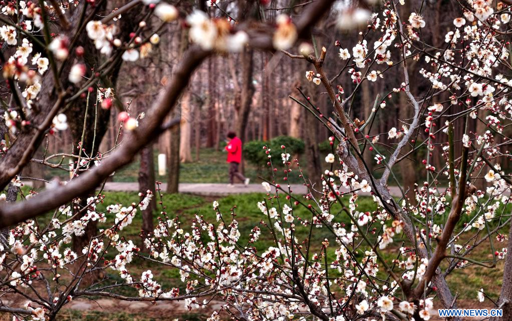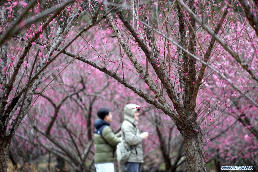 BEIJING, 8 février (Xinhua) -- Une femme admire des fleurs dans un jardin botanique de la ville de Luoyang, dans la province du Henan, dans le centre de la Chine, le 4 février 2026. (Photo : Gao Shanyue)