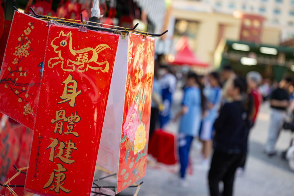 MACAO, 16 février (Xinhua) -- Des gens posent pour des photos lors d'un marché du Nouvel An chinois à Macao, dans le sud de la Chine, le 15 février 2026. (Photo : Cheong Kam Ka)