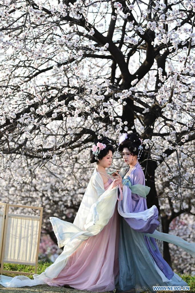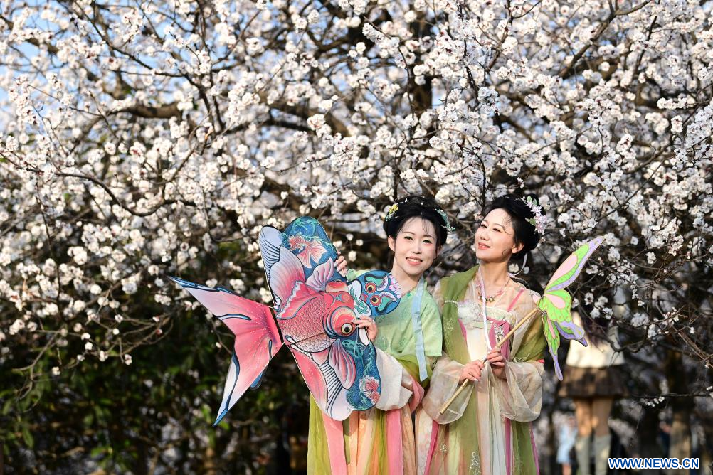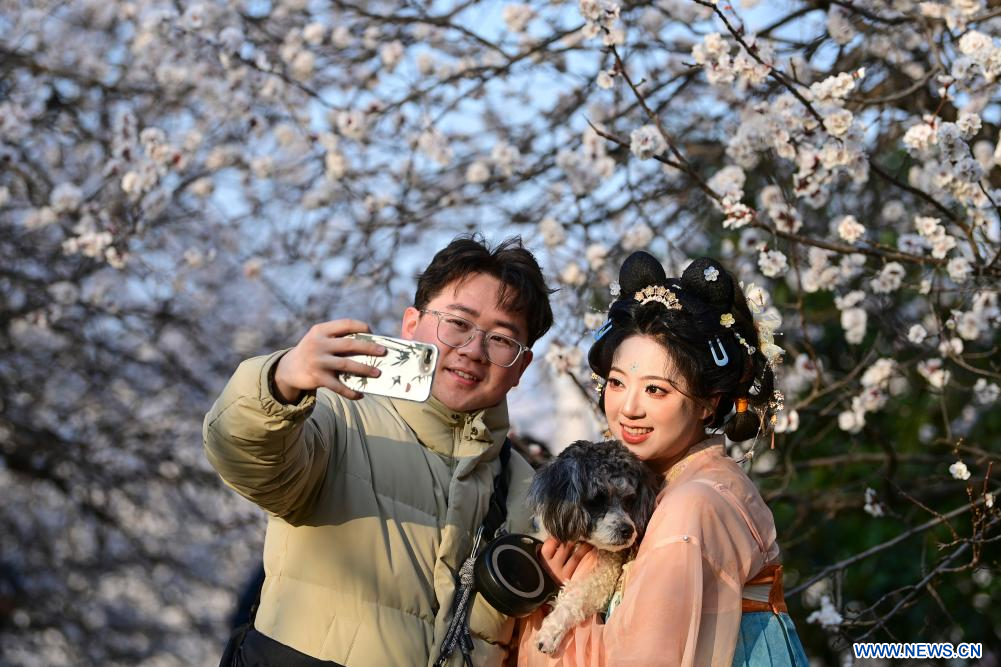 XI'AN, 10 mars (Xinhua) -- Des touristes posent pour des photos devant des arbres en fleurs dans le parc du patrimoine national du palais Daming, à Xi'an, dans la province chinoise du Shaanxi (nord-ouest), le 9 mars 2026. Les fleurs s'épanouissent alors que les températures augmentent en Chine. (Photo : Zou Jingyi)