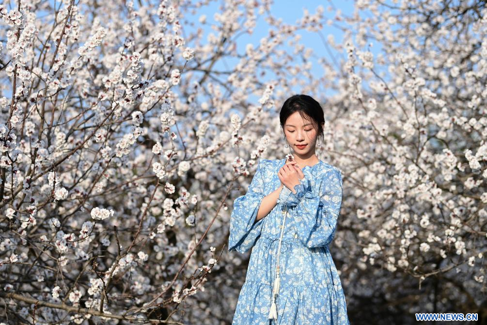 XI'AN, 10 mars (Xinhua) -- Une touriste pose pour des photos devant des arbres en fleurs dans le parc du patrimoine national du palais Daming, à Xi'an, dans la province chinoise du Shaanxi (nord-ouest), le 9 mars 2026. Les fleurs s'épanouissent alors que les températures augmentent en Chine. (Photo : Zou Jingyi)