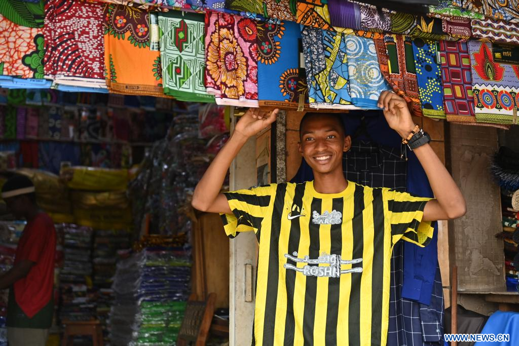 YAOUNDE, 29 mars (Xinhua) -- Un vendeur du tissu se retrouve devant une boutique à Yaoundé, capitale du Cameroun, le 25 mars 2026. (Xinhua/Liu Qiong)