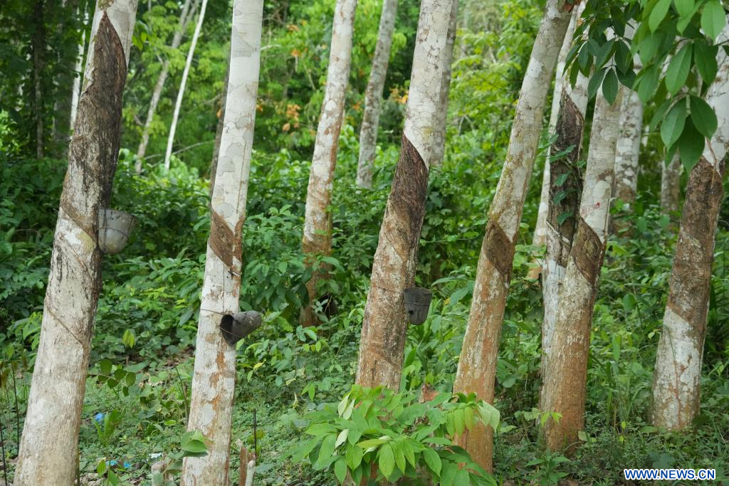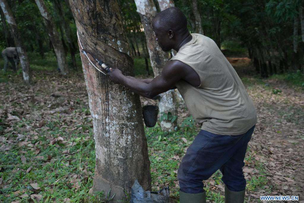 ABIDJAN, 21 avril (Xinhua) -- A l'arrivée de la saison des pluies dans le sud de la Côte d'Ivoire, une fine brume enveloppe au petit matin les plantations d'hévéas. Alignés à perte de vue, les arbres laissent s'écouler lentement un latex blanc, recueilli goutte à goutte par les saigneurs après de fines incisions pratiquées sur les troncs.