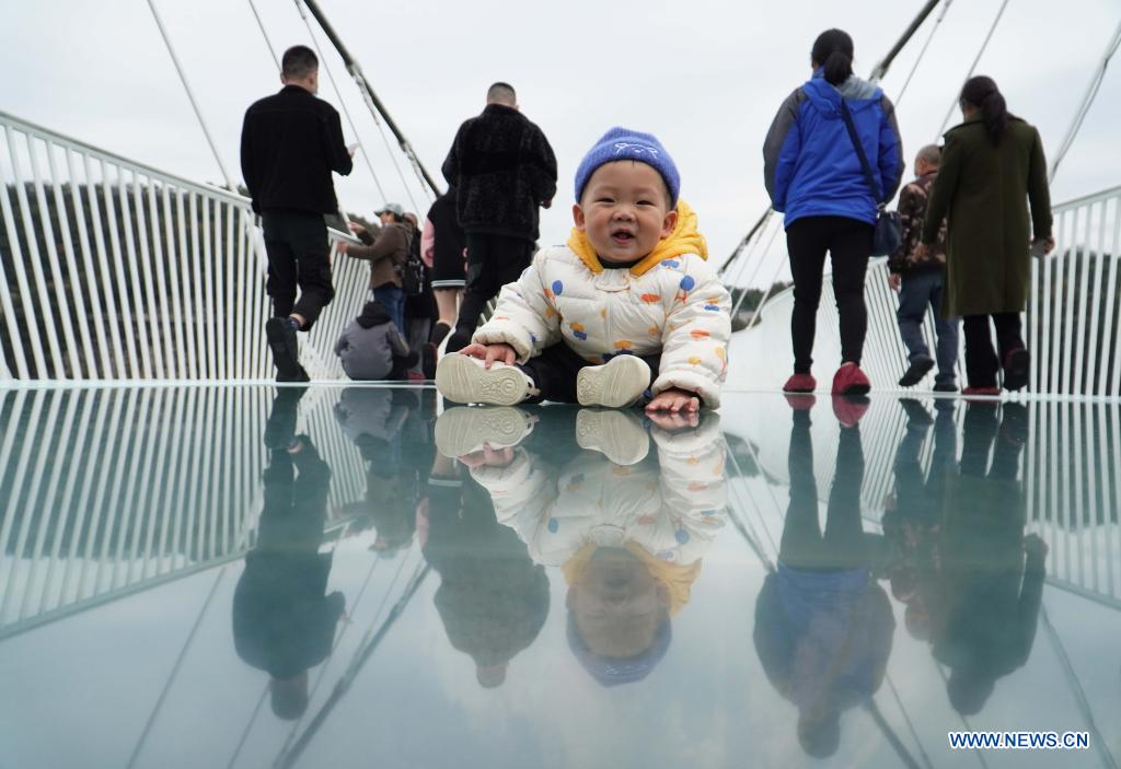 ZHANGJIAJIE, 13 novembre (Xinhua) -- Un petit enfant sur le pont à fond de verre Grand Canyon de Zhangjiajie, dans la province chinoise du Hunan (centre), le 12 novembre 2021. Le pont de 430 mètres de long et de six mètres de large, qui relie deux falaises abruptes à 300 mètres au-dessus du sol, est pavé de 99 panneaux de verre transparent à trois couches. (Photo : Zhao Zhongzhi)