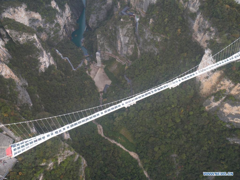 ZHANGJIAJIE, 13 novembre (Xinhua) -- Photo aérienne montrant des touristes sur le pont à fond de verre Grand Canyon de Zhangjiajie, dans la province chinoise du Hunan (centre), le 12 novembre 2021. Le pont de 430 mètres de long et de six mètres de large, qui relie deux falaises abruptes à 300 mètres au-dessus du sol, est pavé de 99 panneaux de verre transparent à trois couches. (Photo : Zhao Zhongzhi)