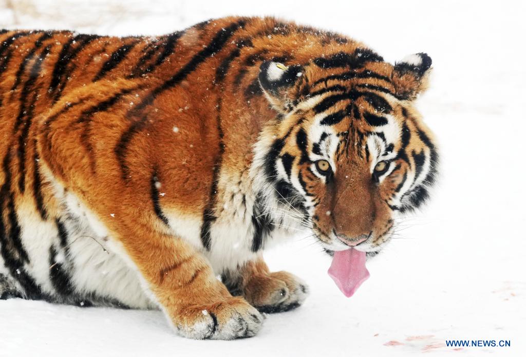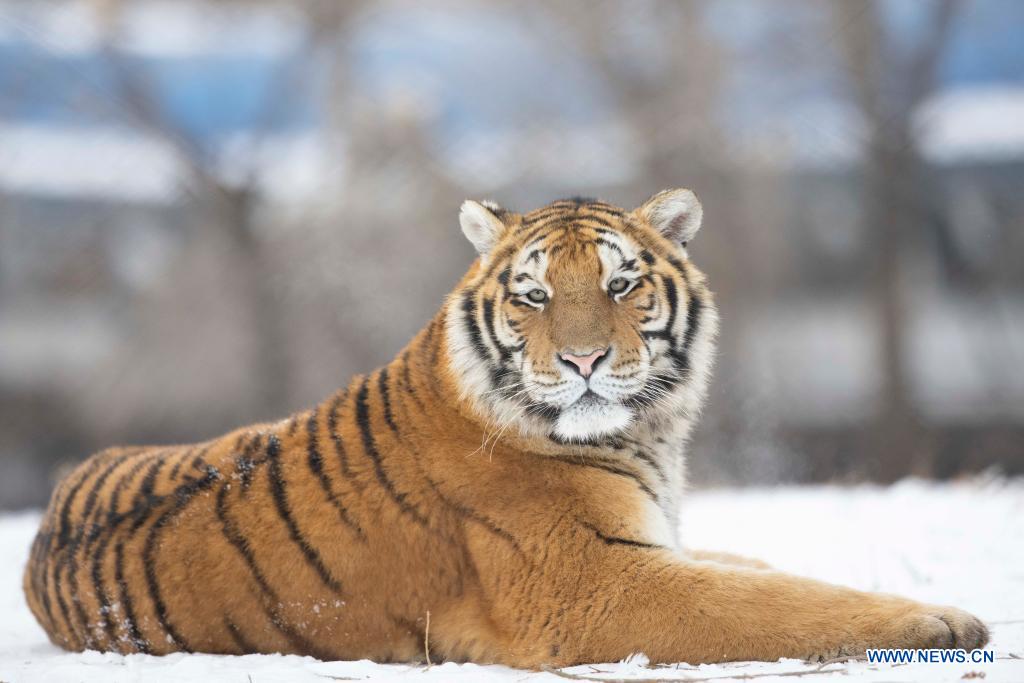 Photo prise le 15 janvier 2022 montrant un tigre de Sibérie au Parc des tigres de Sibérie, dans la province chinoise du Heilongjiang (nord-est). (Xinhua/Wang Jianwei)