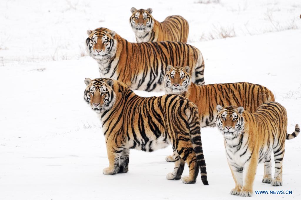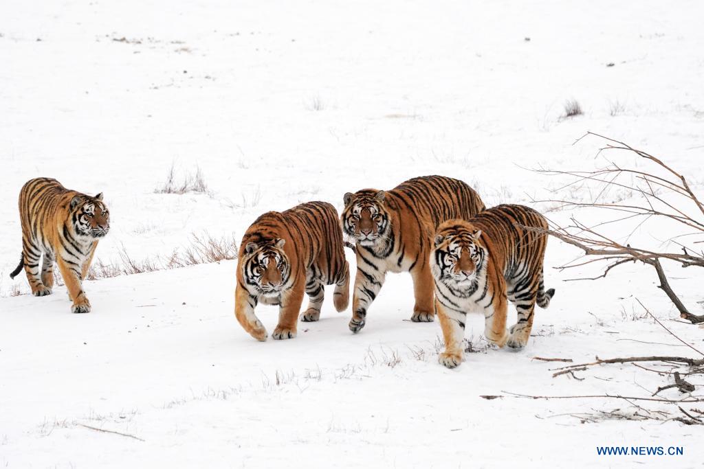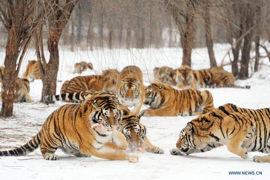 Photo prise le 15 janvier 2022 montrant des tigres de Sibérie au Parc des tigres de Sibérie, dans la province chinoise du Heilongjiang (nord-est). (Xinhua/Wang Jianwei)