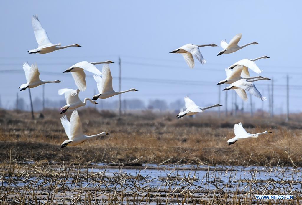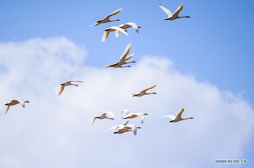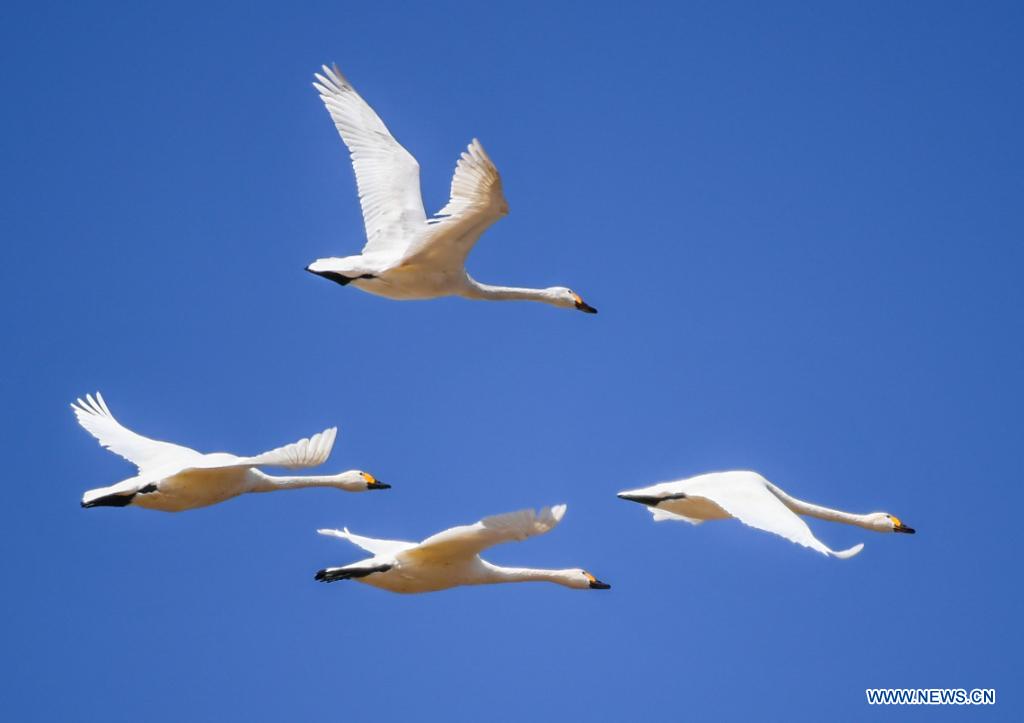 HOHHOT, 31 mars (Xinhua) -- Des cygnes survolent une plaine à Hohhot, dans la région autonome de Mongolie intérieure (nord de la Chine), le 30 mars 2022. (Photo : Peng Yuan)