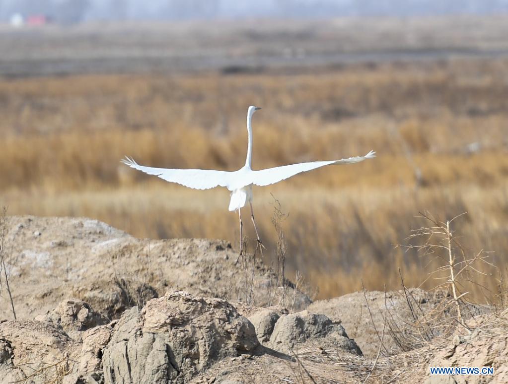 HOHHOT, 31 mars (Xinhua) -- Une aigrette survole une plaine à Hohhot, dans la région autonome de Mongolie intérieure (nord de la Chine), le 30 mars 2022. (Photo : Peng Yuan)