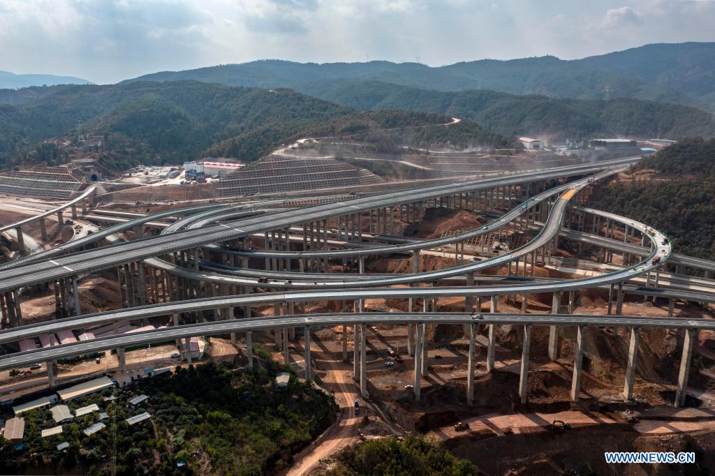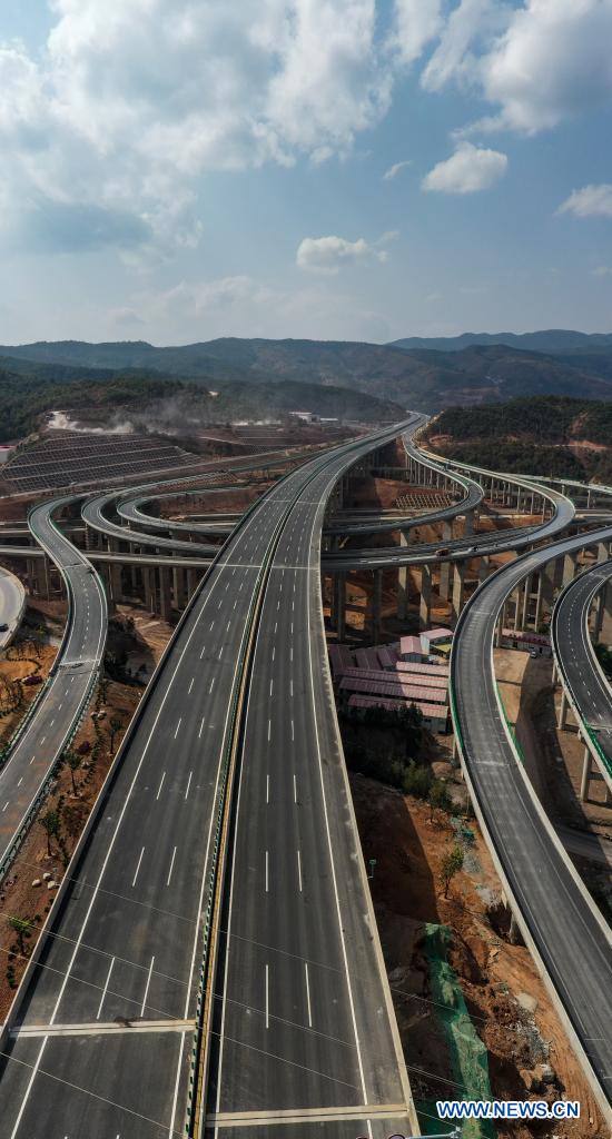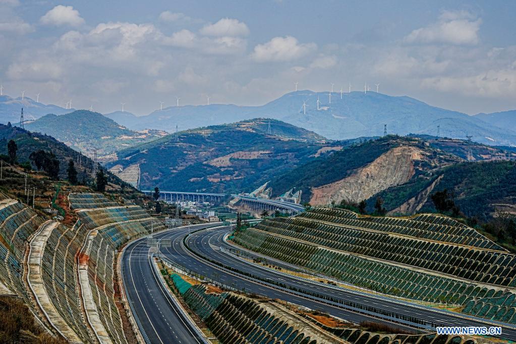 DALI, 31 mars (Xinhua) -- Vue de la nouvelle autoroute Chuxiong-Dali dans la province chinoise du Yunnan (sud-ouest), le 29 mars 2022. La nouvelle autoroute Chuxiong-Dali a été officiellement ouverte à la circulation jeudi. Elle réduit le temps de trajet entre Chuxiong et Dali à une heure et demie. (Photo : Jiang Wenyao)