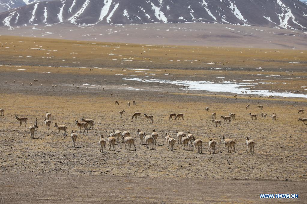 GERZE, 1er avril (Xinhua) -- Des antilopes tibétaines dans le district de Gerze de la préfecture d'Ali, dans la région autonome du Tibet (sud-ouest de la Chine), le 27 mars 2022. Près de 10.000 antilopes tibétaines se sont rassemblées à Gerze, un événement rare qui serait lié à l'amélioration de la biodiversité et aux efforts de protection. (Photo : Penba)