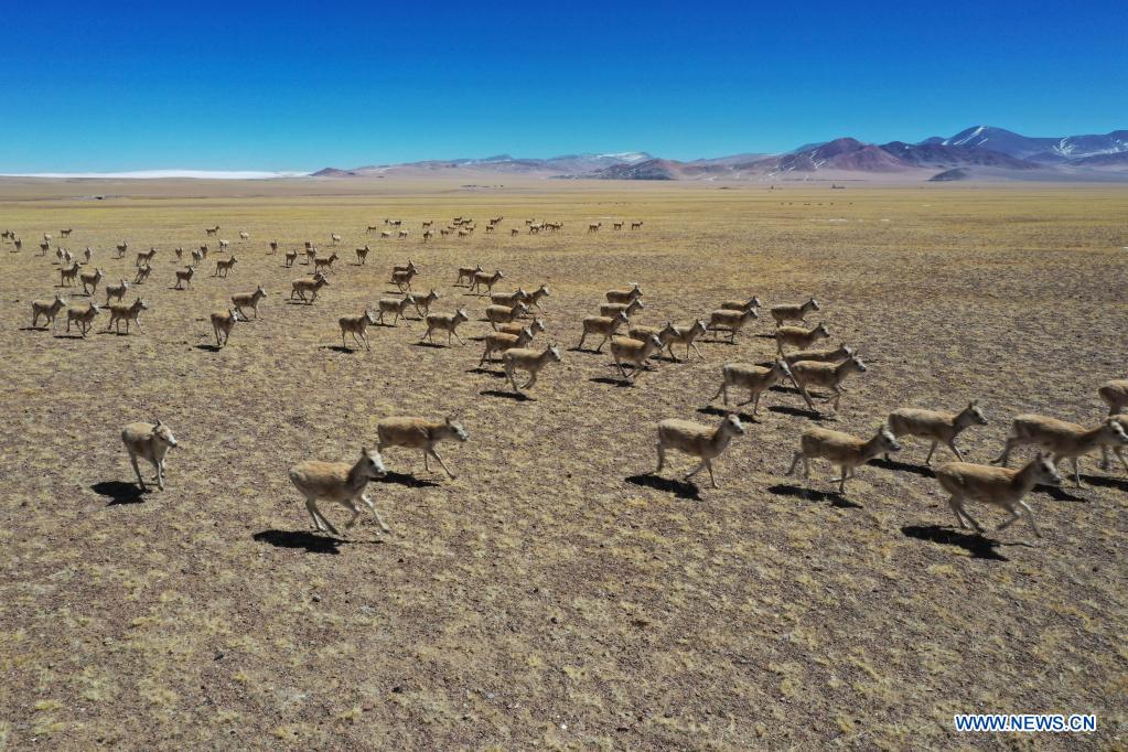 GERZE, 1er avril (Xinhua) -- Des antilopes tibétaines dans le district de Gerze de la préfecture d'Ali, dans la région autonome du Tibet (sud-ouest de la Chine), le 27 mars 2022. Près de 10.000 antilopes tibétaines se sont rassemblées à Gerze, un événement rare qui serait lié à l'amélioration de la biodiversité et aux efforts de protection. (Photo : Sonam Rinqen)