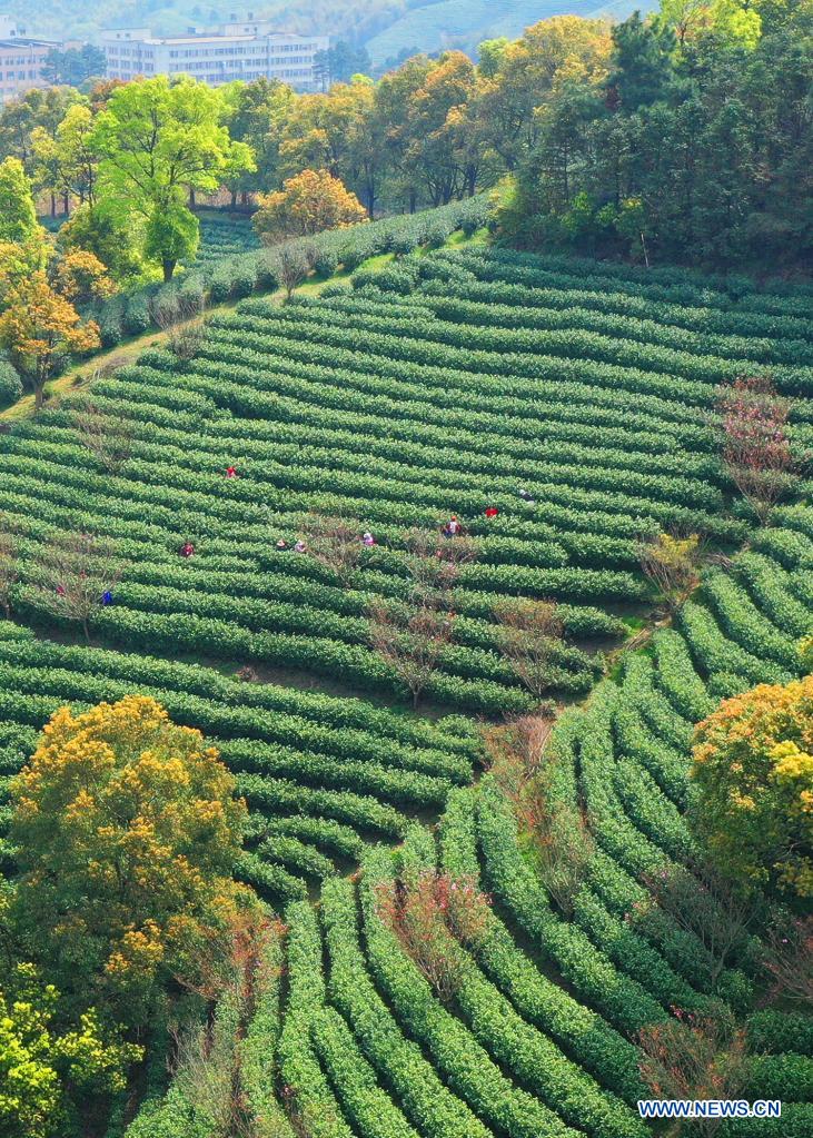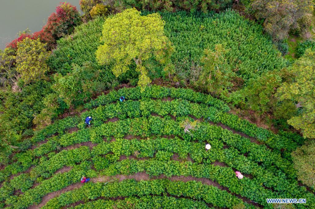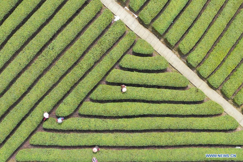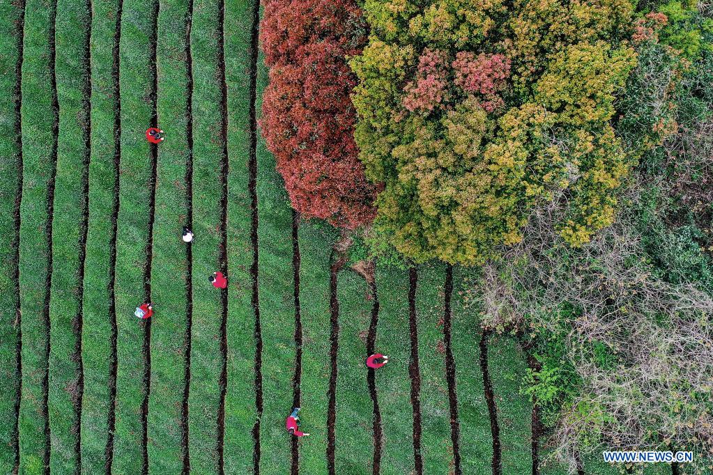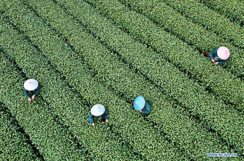 Des agriculteurs cueillent des feuilles de thé dans une plantation de thé à Hangzhou, dans la province chinoise du Zhejiang (est), le 30 mars 2022. (Xinhua/Long Wei)
