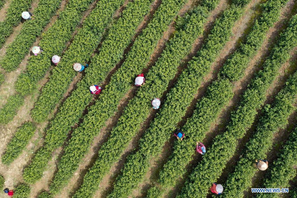 Des agriculteurs cueillent des feuilles de thé dans une plantation de thé à Wenling, dans la province chinoise du Zhejiang (est), le 30 mars 2022. (Xinhua/Xu Weijie)