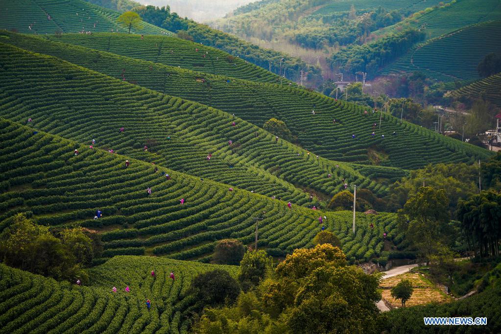 Des agriculteurs cueillent des feuilles de thé dans une plantation de thé dans le district d'Anji, dans la province chinoise du Zhejiang (est), le 30 mars 2022. (Xinhua/Xia Pengfei)