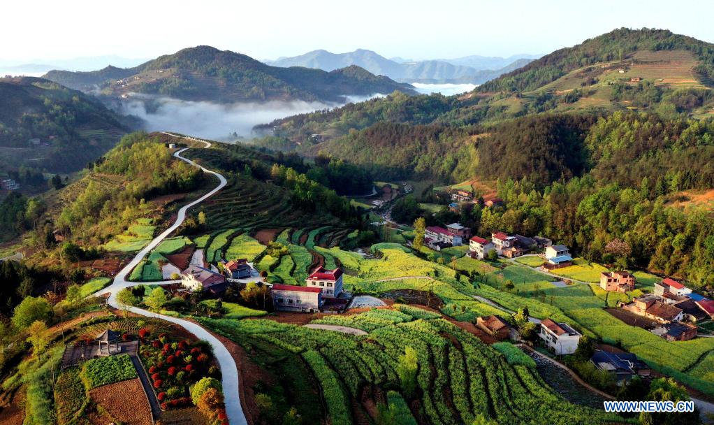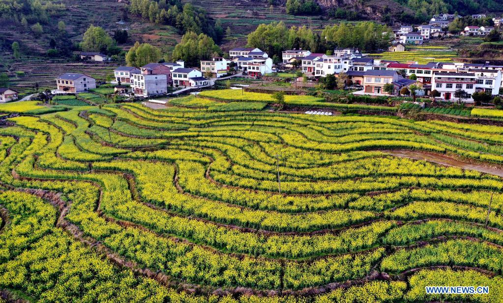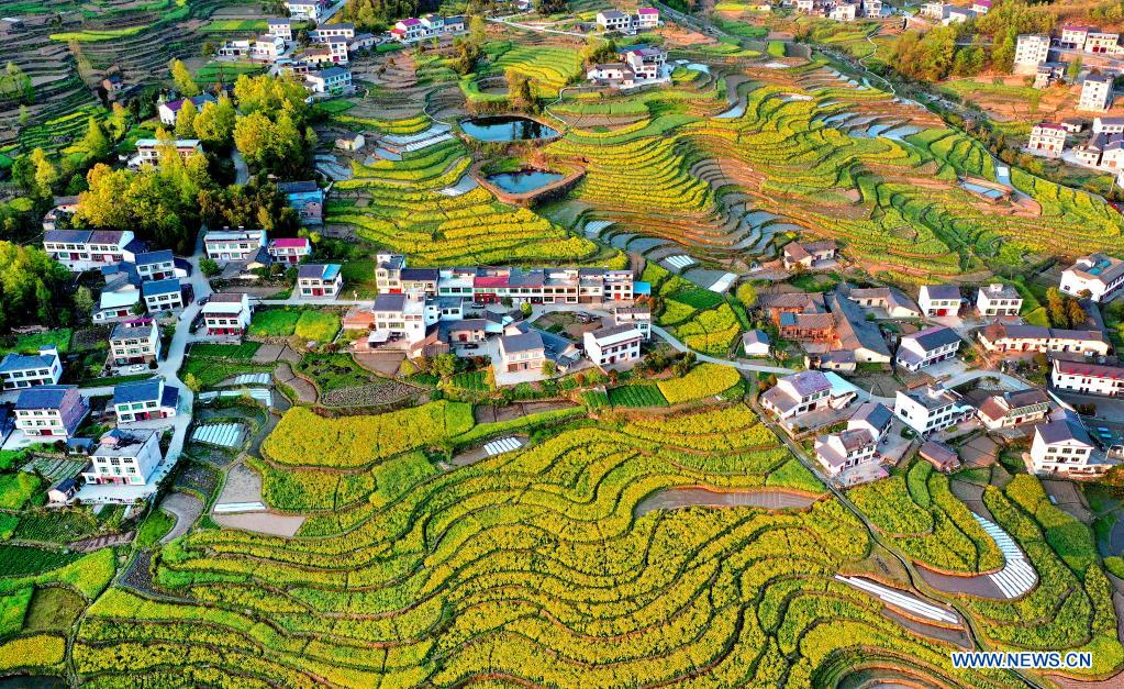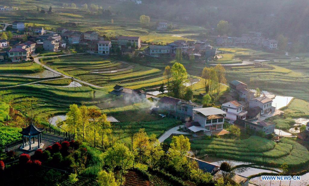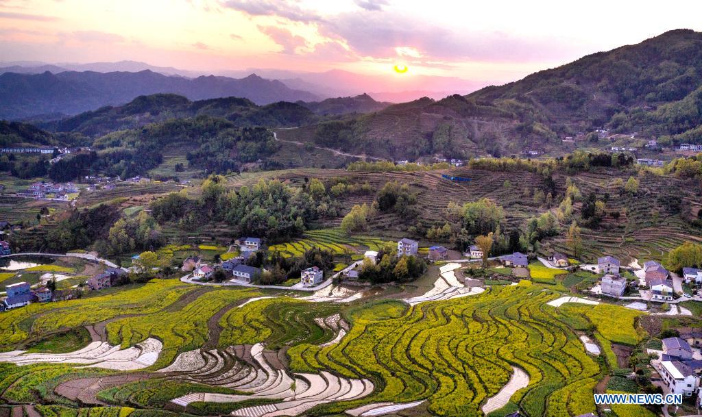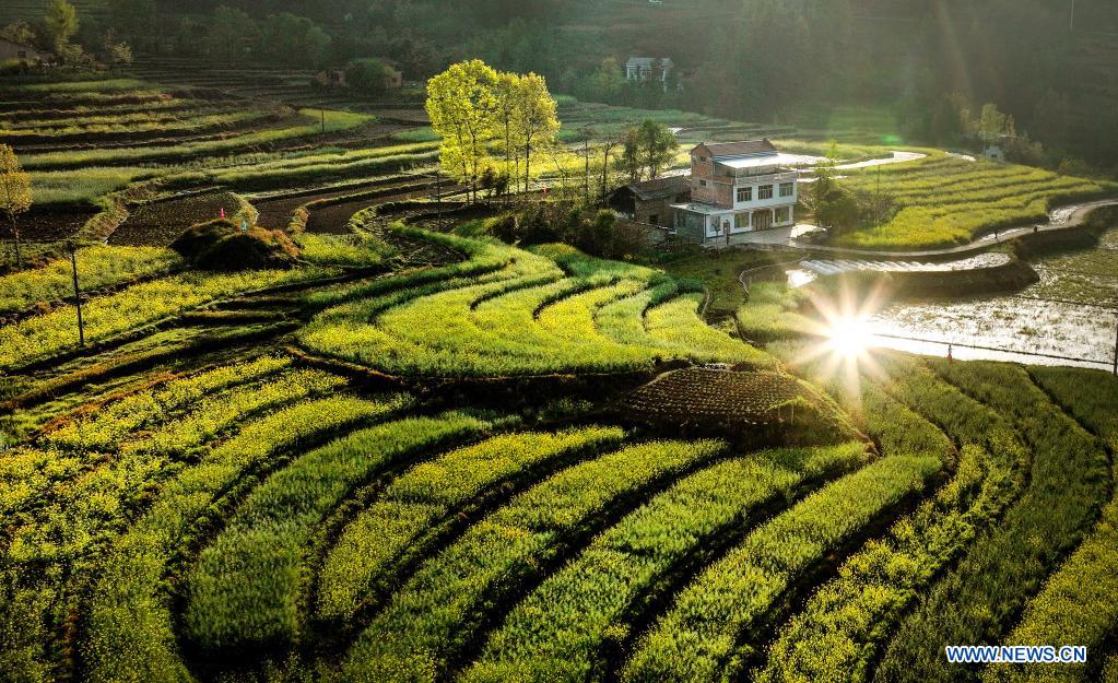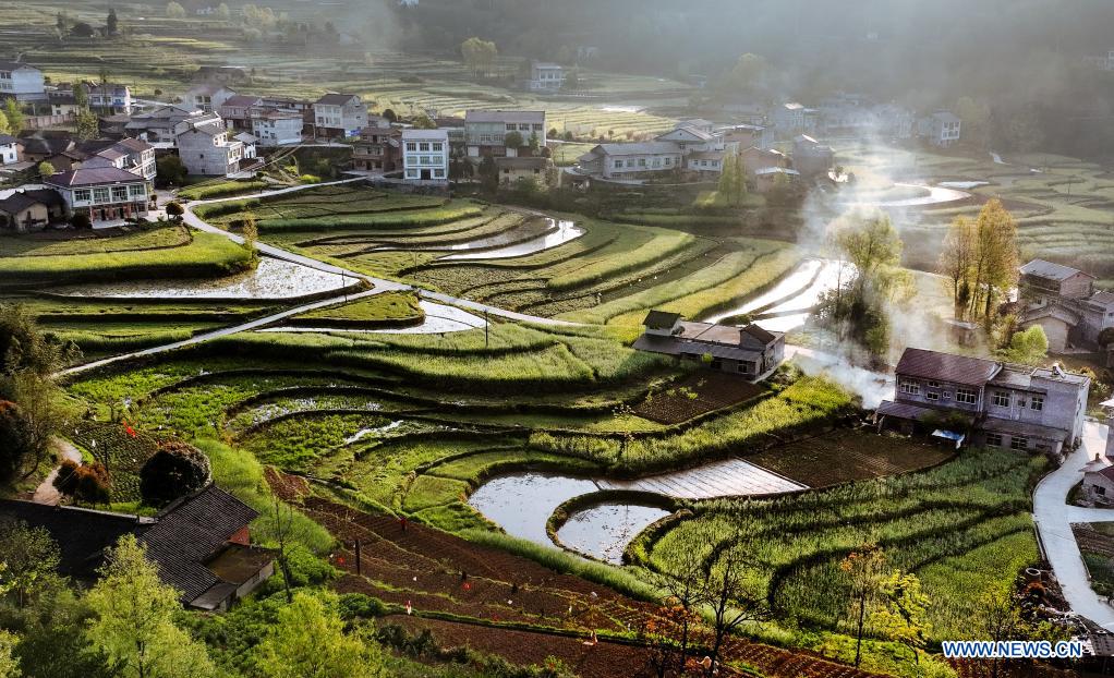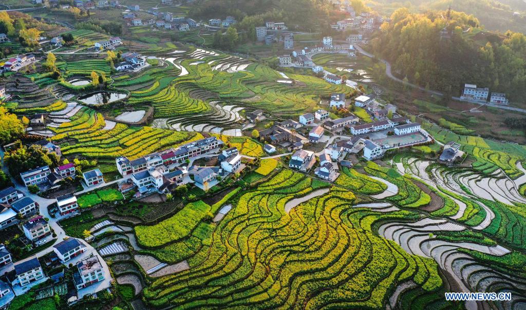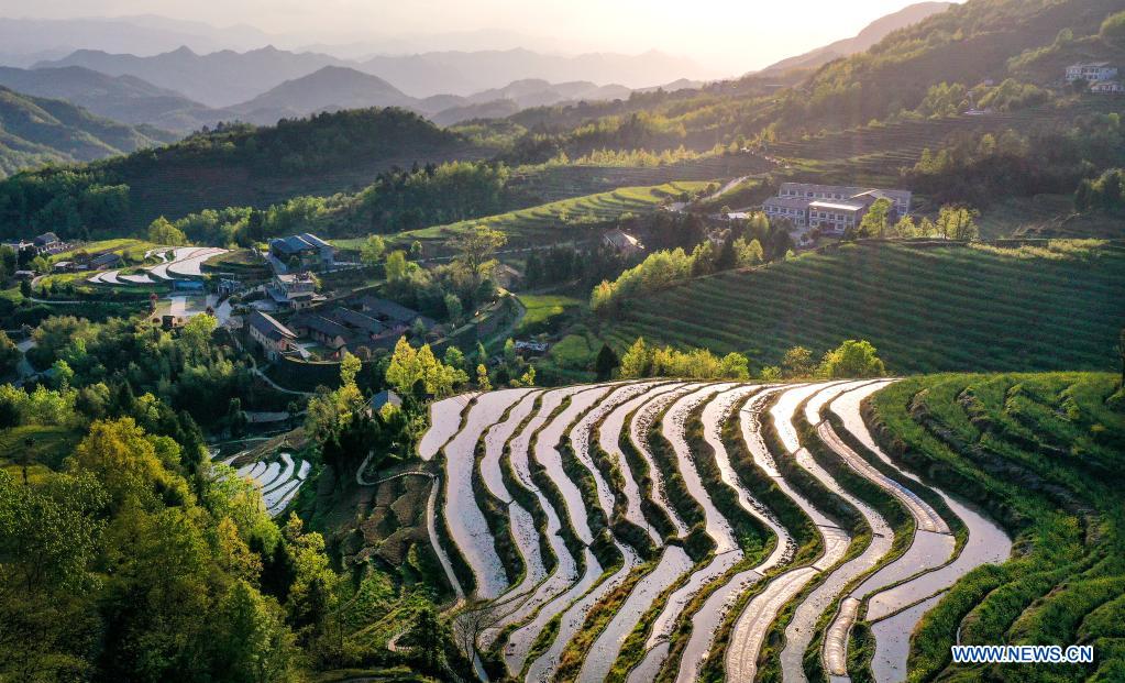 Vue aérienne des champs en terrasses à Ankang, dans la province chinoise du Shaanxi (nord-ouest), le 3 avril 2022. (Xinhua/Tao Ming)