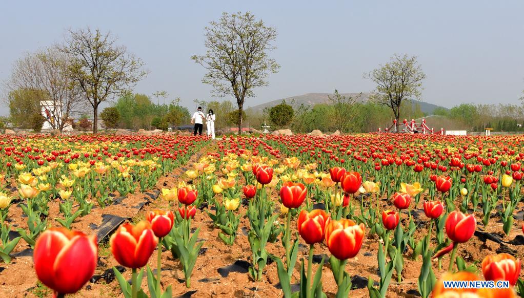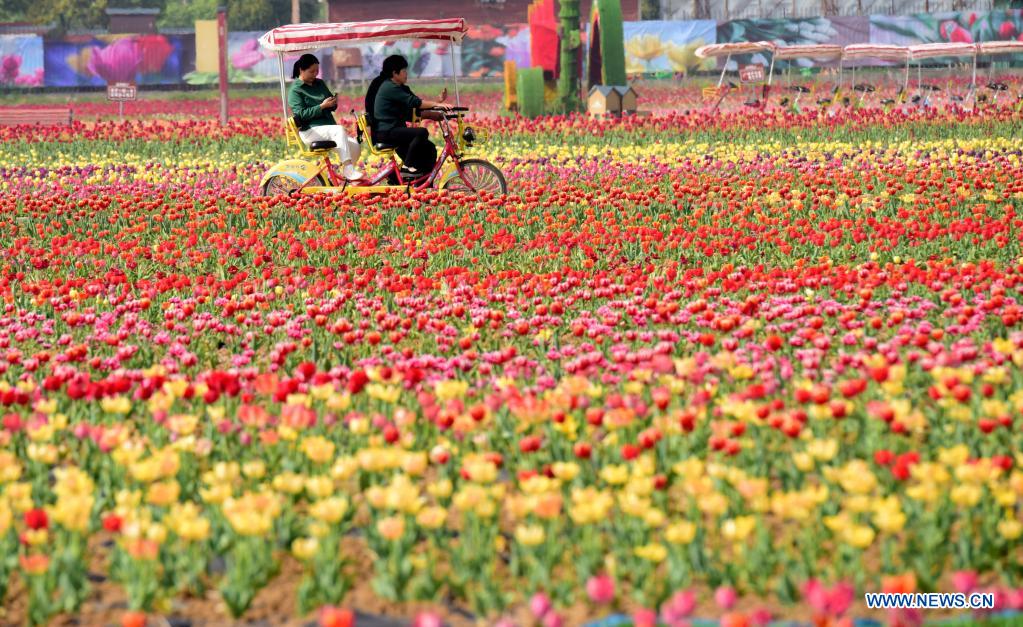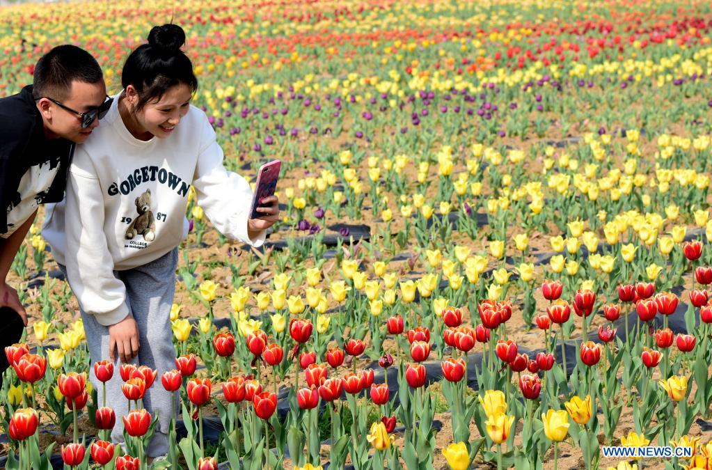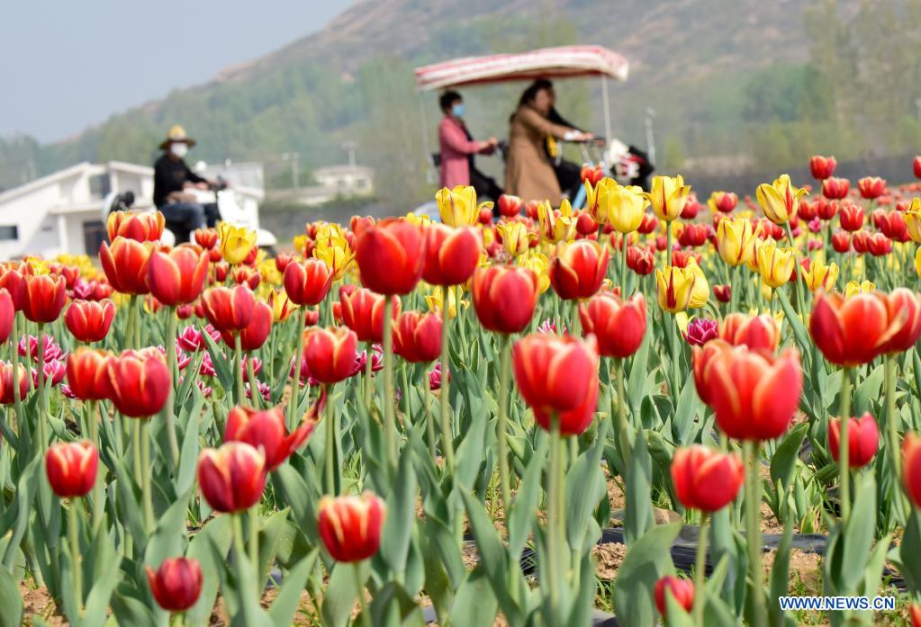 Des touristes admirent des tulipes dans un site touristique du district de Suiping, dans la province chinoise du Henan (centre), le 7 avril 2022. (Xinhua/Zhu Xiang)