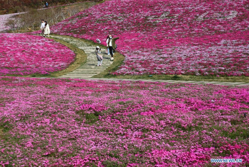 JINAN, 9 avril (Xinhua) -- Des gens admirent des fleurs à Jinan, dans la province chinoise du Shandong (est), le 8 avril 2022. (Photo : Xu Suhui)