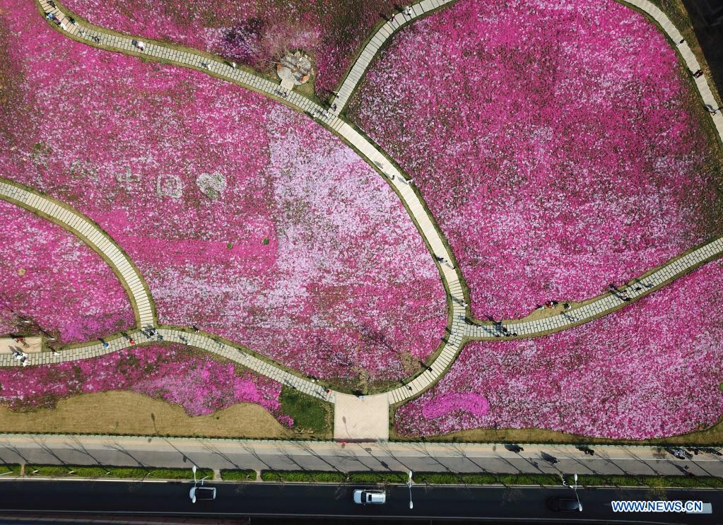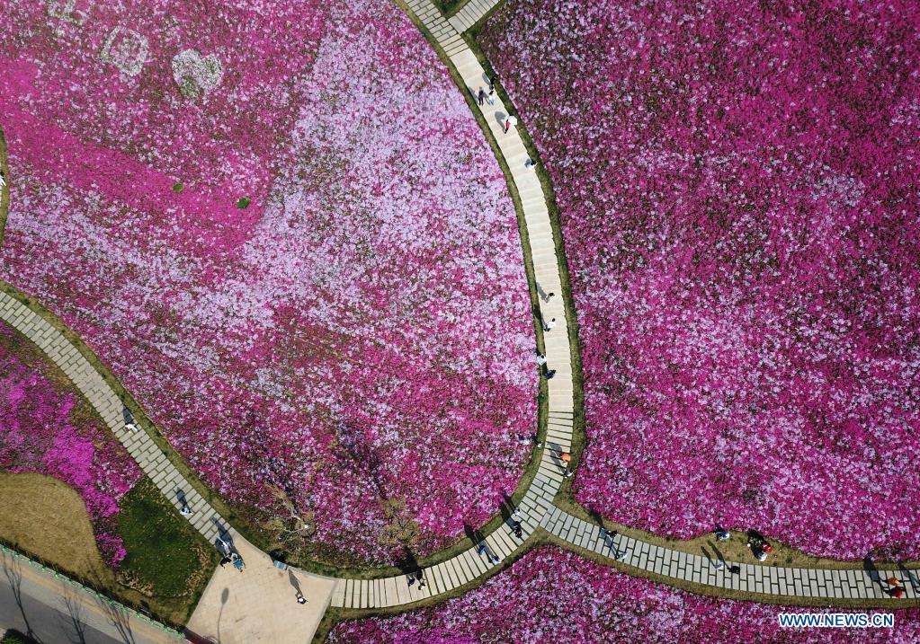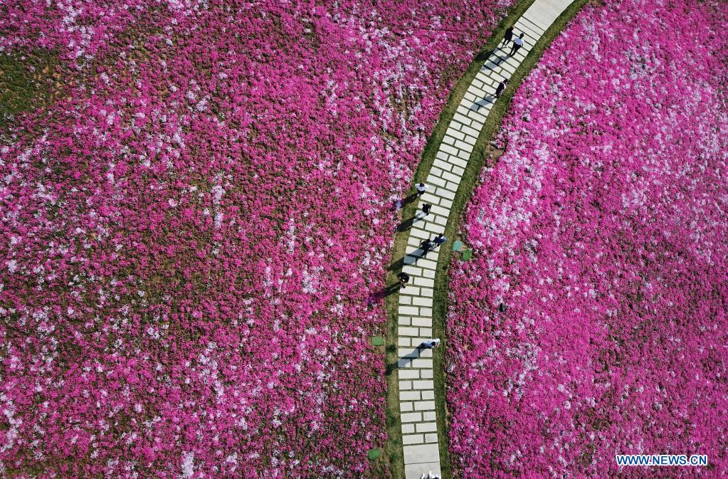 JINAN, 9 avril (Xinhua) -- Photo aérienne de gens admirant des fleurs à Jinan, dans la province chinoise du Shandong (est), le 8 avril 2022. (Photo : Xu Suhui)