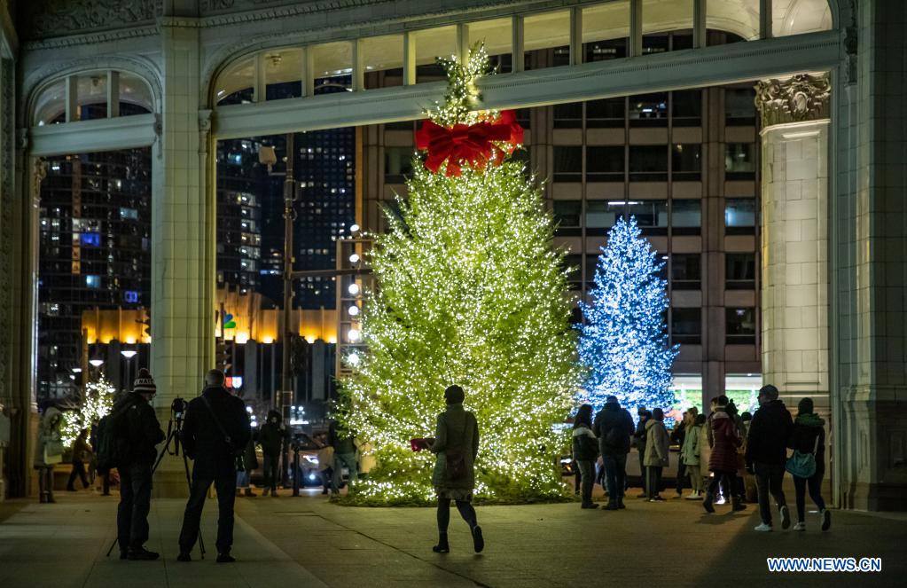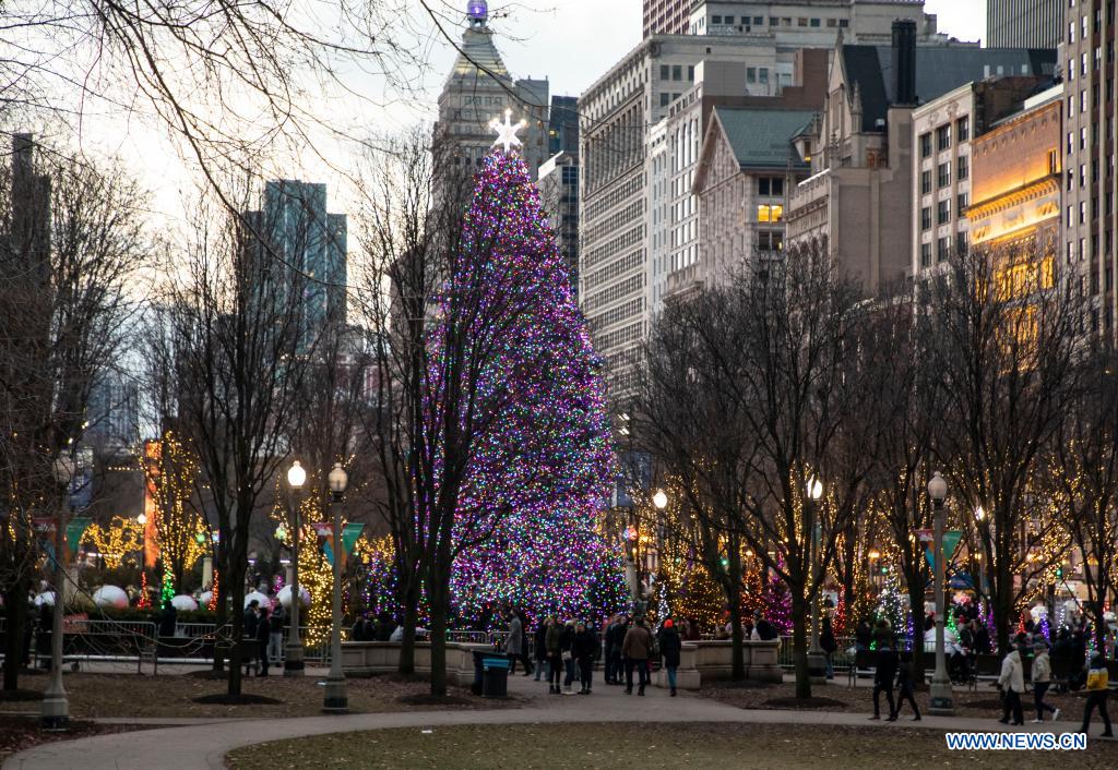 CHICAGO, 21 décembre (Xinhua) -- Le sapin de Noël officiel de Chicago pendant la saison des fêtes à Chicago, aux Etats-Unis, le 19 décembre 2021. (Photo : Joel Lerner)
