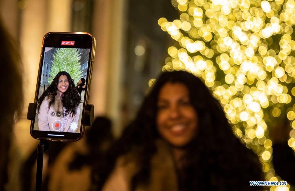 CHICAGO, 21 décembre (Xinhua) -- Une femme pose pour une photo devant un sapin de Noël sur l'avenue de Michigan, à Chicago, aux Etats-Unis, le 19 décembre 2021. (Photo : Joel Lerner)