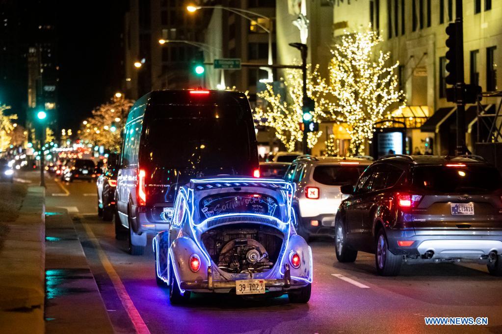 CHICAGO, 21 décembre (Xinhua) -- Une VW Beetle sur l'avenue de Michigan pendant la saison des fêtes à Chicago, aux Etats-Unis, le 19 décembre 2021. (Photo : Joel Lerner)