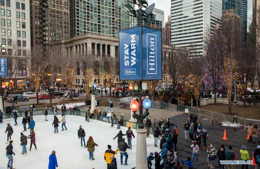 CHICAGO, 21 décembre (Xinhua) -- Des patineurs dans la patinoire du Millennium Park à Chicago, aux Etats-Unis, le 19 décembre 2021. (Photo : Joel Lerner)