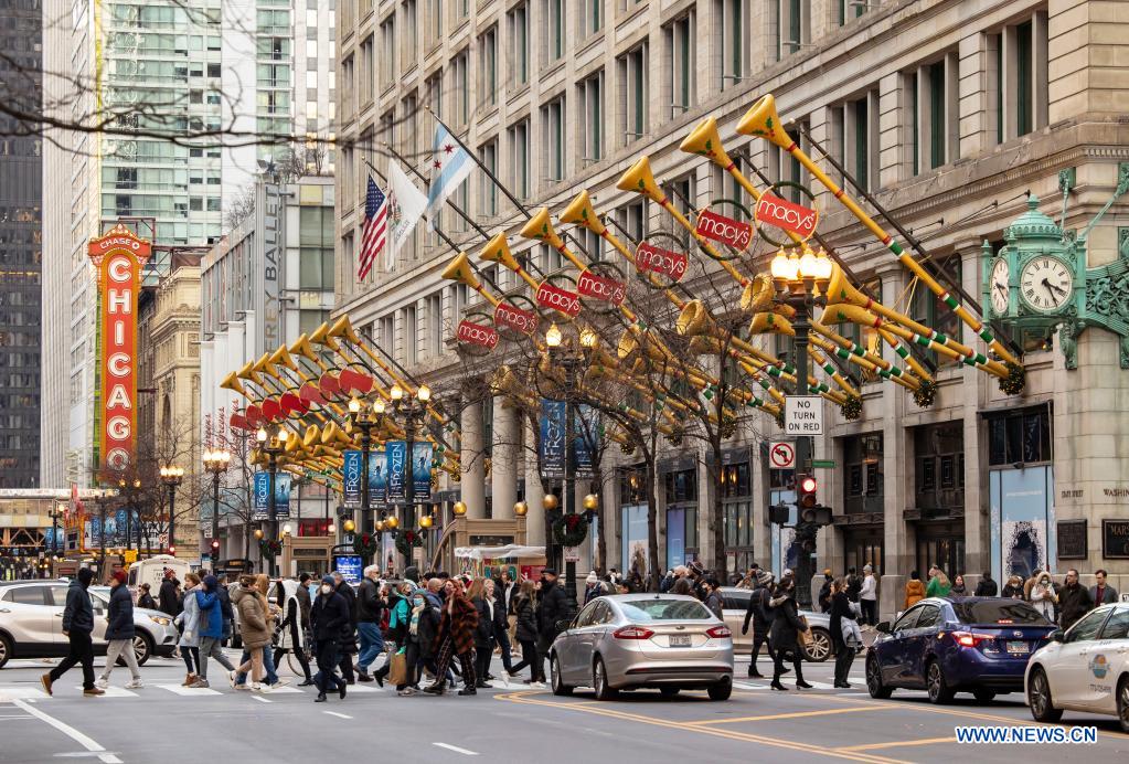 CHICAGO, 21 décembre (Xinhua) -- Une foule de gens afflue vers le quartier commercial de State Street, à Chicago, aux Etats-Unis, le 19 décembre 2021. (Photo : Joel Lerner)
