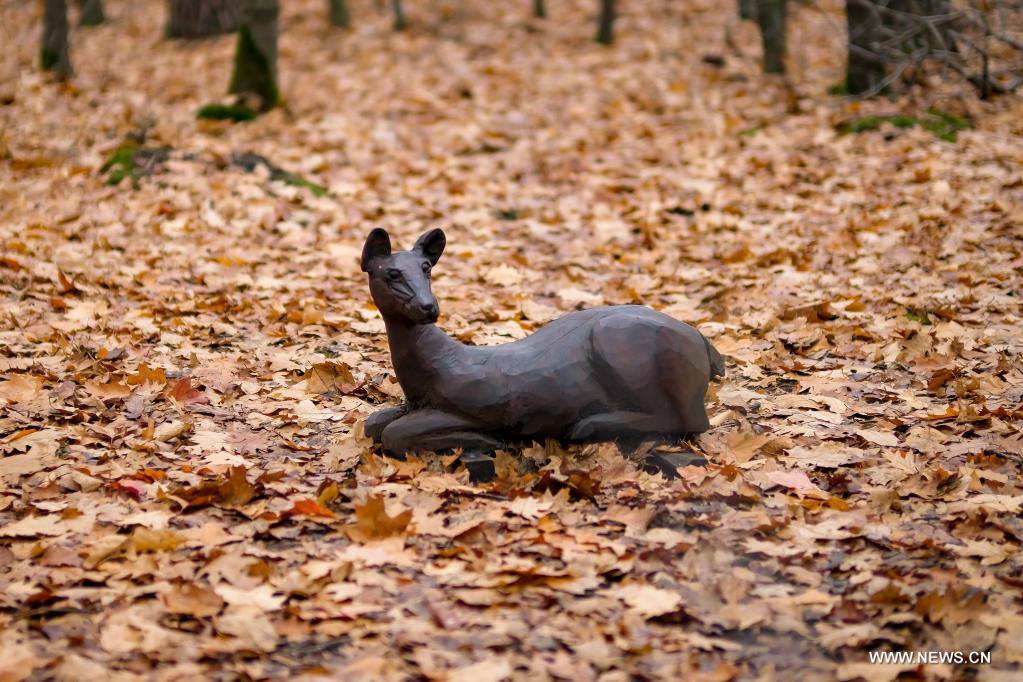 LIMBOURG, 20 novembre (Xinhua) -- Une statue de cerf dans la réserve naturelle de Bosland, dans la province de Limbourg, en Belgique, le 19 novembre 2021. (Photo : Zhang Cheng)