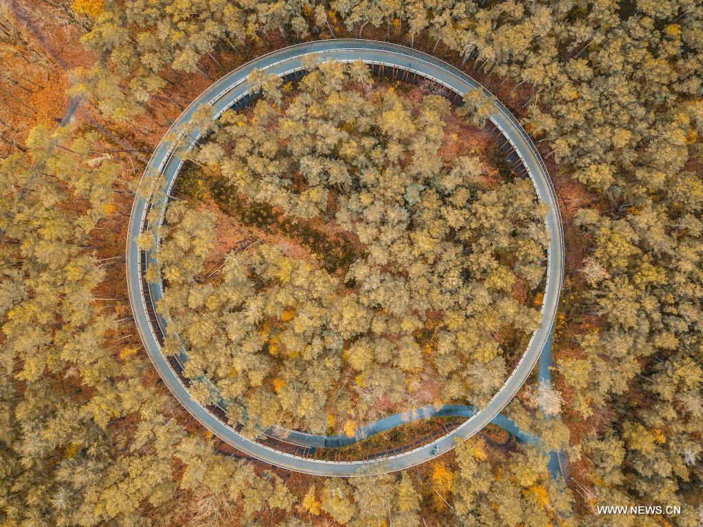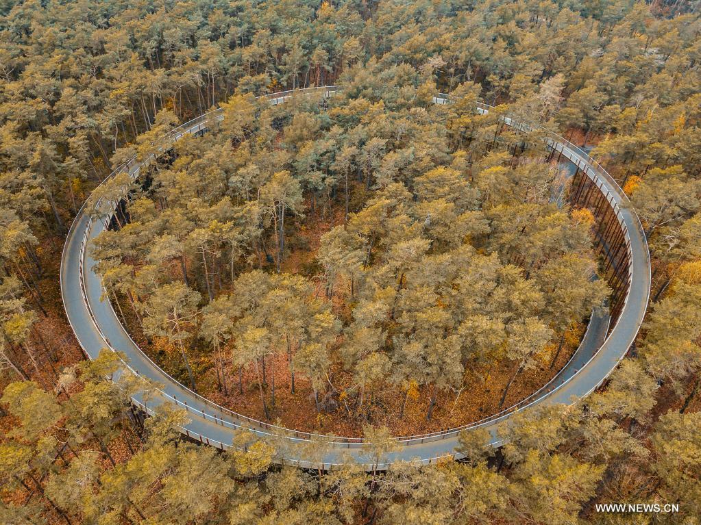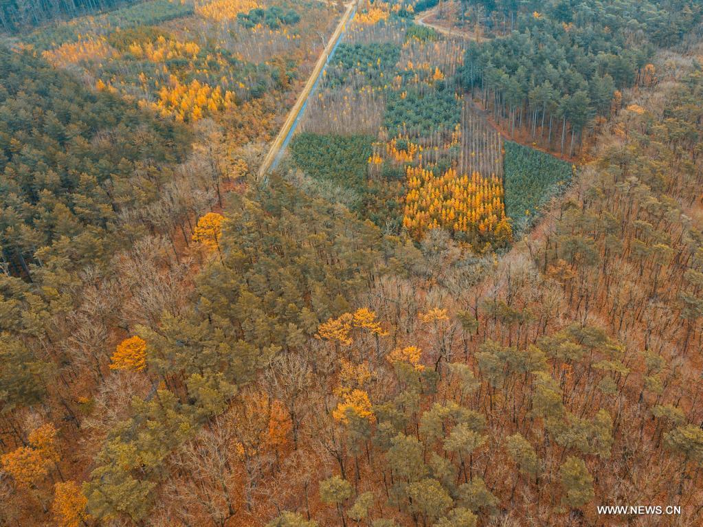 LIMBOURG, 20 novembre (Xinhua) -- Photo aérienne prise 19 novembre 2021 de la réserve naturelle de Bosland, dans la province de Limbourg, en Belgique. (Photo : Zhang Cheng)