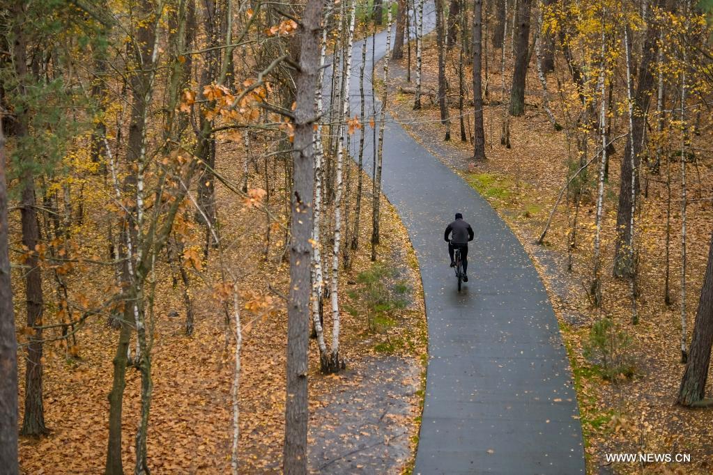 LIMBOURG, 20 novembre (Xinhua) -- Un homme fait du vélo dans la réserve naturelle de Bosland, dans la province de Limbourg, en Belgique, le 19 novembre 2021. (Photo : Zhang Cheng)