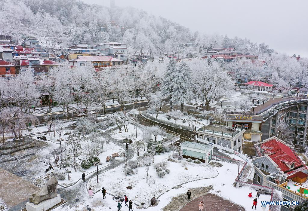 JIUJIANG, Jiangxi, 27 décembre (Xinhua) -- Photo aérienne du paysage du site touristique du mont Lushan après des chutes de neige à Jiujiang, ville de la province chinoise du Jiangxi (est), le 25 décembre 2021. (Photo : Wan Xiang)