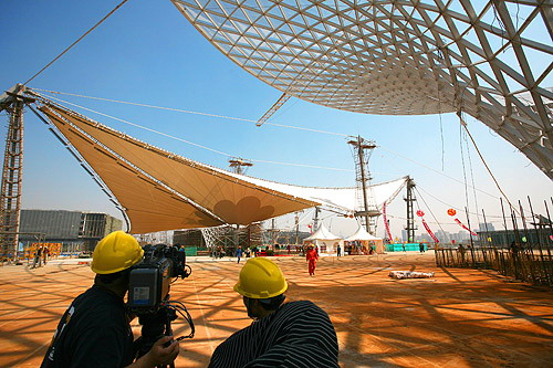 Les deux premières vallées de soleil en forme de trompette le long de l'Axe de l'Expo ont été achevées le 30 avril, ce qui signifie que les travaux des structures principales de l'Axe de l'Expo seront bientôt finis. ZHONG Yanqun, directrice adjointe professionnelle du Comité exécutif pour l'Expo 2010 et DING Hao, directeur adjoint du Bureau de coordination de l'Expo 2010, ont assisté à la cérémonie d'achèvement.
