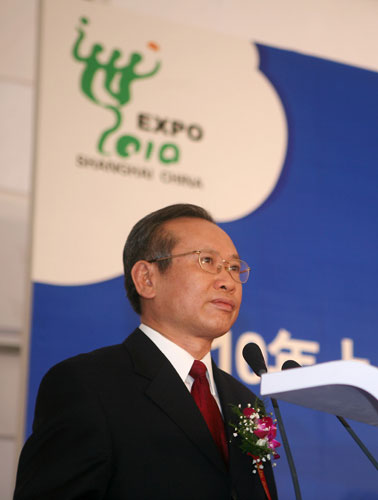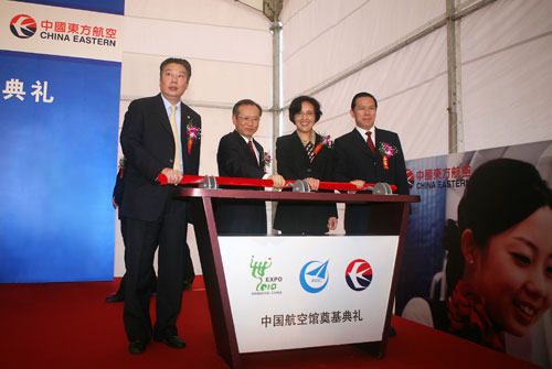HUANG Shuhe, directeur adjoint de la Commission nationale de Contrôle et de Gestion des Biens publics, ZHONG Yanqun, directrice adjointe professionnelle du Comité exécutif pour l'Expo 2010, HONG Hao, directeur du Bureau de coordination, LIN Zuoming, directeur général d'Aviation Industry Corporation of Chine (AVIC), LIU Shaoyong, directeur général de China Eastern Air Holding Company (China Eastern Airlines), et DING Hao, directeur adjoint du Bureau de coordination, ont posé la première pierre pour le pavillon aérienaéronautique de Chine.
