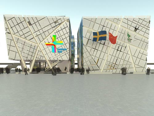 La Suède est le premier pays de l'Europe du Nord ayant commencé la construction de son pavillon à l'Expo 2010, qui occupe une superficie de 3000 m2. Ce pavillon est recyclable, ce qui s'accorde bien avec l'idée durable de la Suède. Les visiteurs peuvent aller et revenir dans les passages cruciformes qui relient les différentes parties du pavillon. Ces passages symbolisent l'interaction harmonieuse entre la ville et la campagne.