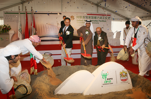 Le pavillon des Émirats Arabes Unis (EAU) à l'Expo 2010 a été mis en construction le 2 avril. HUANG Jianzhi, directeur adjoint du Bureau de coordination, Mohammed Rahed Al Boot, ambassadeur des Émirats Arabes Unis en Chine et Salem Saeed Al Ameri, commissaire général des Émirats Arabes Unis pour l'Expo 2010 ont assisté à la cérémonie.