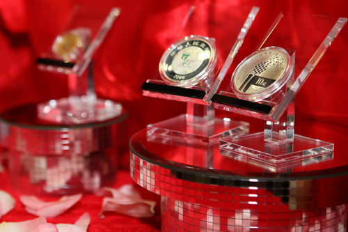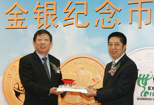 Ma Delun, vice-gouverneur de la Banque populaire de Chine, présente, au nom de la banque, les pièces d'or et d'argent pour l'Exposition universelle de Shanghai.
