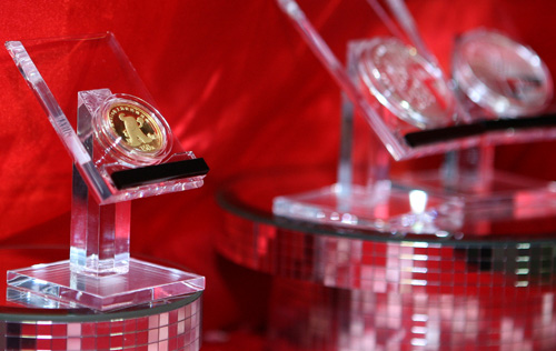 Ma Delun (à gauche), vice-gouverneur de la Banque populaire de Chine, et Yang Xiong, maire adjoint de la ville de Shanghai, dévoilent les pièces d'or et d'argent.