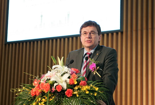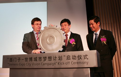 HONG Hao (centre), directeur du Bureau de coordination de l'Expo 2010, Richard Hausmann (gauche), CEO de SIEMENS Ltd.,China, lance "la campagne de rêve pour Siemens-Expo ".