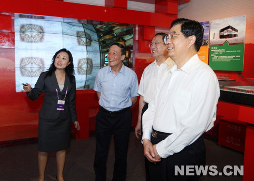 Le président chinois Hu Jintao (Centre) a visité le 15 juillet à Beijing une exposition sur l'Exposition universelle Shanghai 2010.